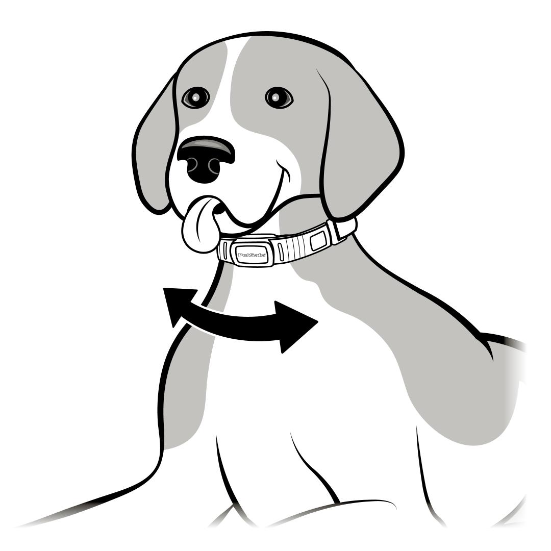 - The collar strap needs to be tight enough that the collar does not move if the pet shakes or moves. Test the fit by trying to gently shift the collar back and forth.